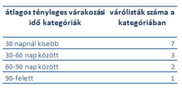 A tényleges várakozási időre vonatkozó adata valódi várakozási helyzetet jellemzi. Az indikátor az ellátással már lezárt esetek teljesítmény elszámolási jelentéssel egyeztetett, ellenőrzött, hibátlan várólista adata alapján kerül meghatározásra, az egyes esetek várólistára történő felvétele és az elvégzett ellátás időpontja közötti időtartamok átlagolásával.