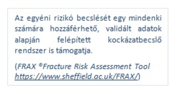 A megfelelő kalcium- és D-vitamin-bevitel tehát a bázisterápia, amely minden csontritkulás-kezelés alapja és elhagyhatatlan velejárója. A kalcium- és D-vitamin-bevitel kiegészítő pótlása a társadalombiztosítás által akkor támogatott, ha a dokumentáltan gondozott posztmenopauzás nő vagy 55 év feletti férfi betegsége igazolódott vagy a fokozott töréskockázati tényezőkből legalább három egyidejűleg bizonyítottan fennáll, vagy a FRAX alapján számított 10 éves törési kockázata magas (általános >20%, illetve csípő >3%).