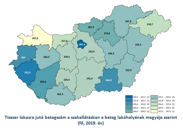 A szakellátásban megjelent betegek száma tízezer lakosra vetítve 273,7 fő volt országosan. Az egyes megyék részesedése hasonló megoszlást mutat az ellátó intézmény megyéje, illetve az ellátott beteg lakóhelyének megyéje szerint is: mindkét kimutatás szerint lakosságszám-arányosan a főváros, illetve Zala megye érintett a leginkább.