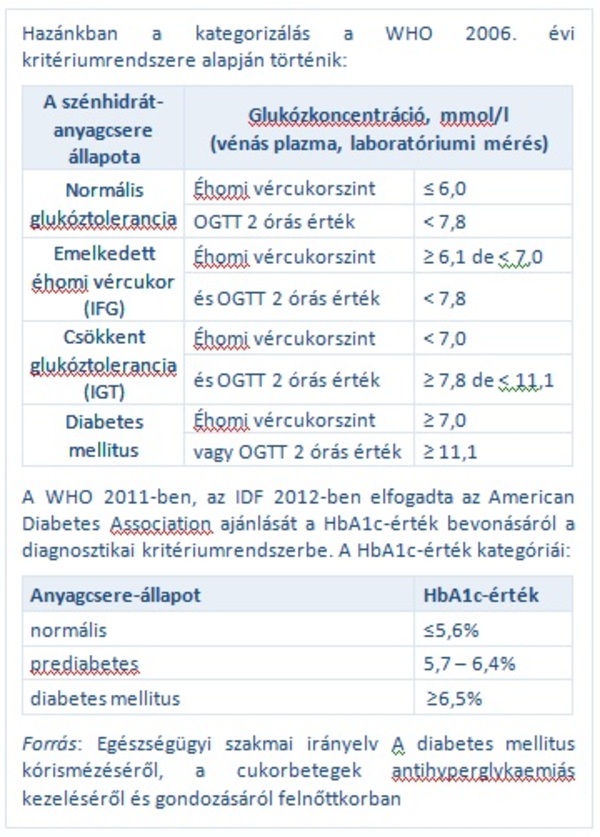 Ha klasszikus tünetek hiányában az éhomi vércukorszint értéke két különböző alkalommal mérve eléri, vagy meghaladja a 7,0 mmol/l értéket; az OGTT kapcsán az éhomi vércukor eléri vagy meghaladja a 7,0 mmol/l értéket és/vagy a 120 perces érték eléri vagy meghaladja a 11,1 mmol/l értéket (a kóros terhelési eredmény egy másik időpontban végzett méréssel megerősítendő); a standard módon mért HbA1c-érték ≥ 6,5%.