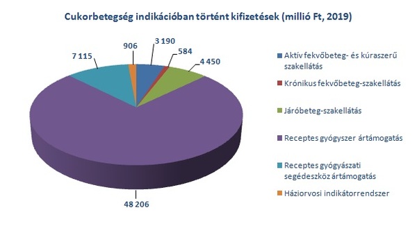 2019-ben cukorbetegség miatt az Egészségbiztosítási Alapból összesen 63,5 milliárd forint került kifizetésre. A finanszírozás legnagyobb hányadát a vényhez kötött gyógyszerek (inzulin és orális antidiabetikumok) árához nyújtott támogatás adta (76%), de a gyógyászati segédeszközök (vércukorszint mérő tesztcsíkok, inzulinpumpák) ártámogatásának részesedése is jelentős volt (11%):