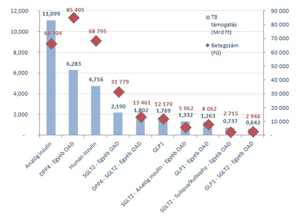 Az elmúlt évek adatai alapján megállapítható, hogy a cukorbetegség gyógyszereinek ártámogatása folyamatos emelkedő tendenciát mutat, ami az orális antidiabetikumok (OAD) esetén részben az e készítményekkel kezeltek számának növekedésével magyarázható. Az egy betegre jutó kiadás az inzulinkészítmények esetén magasabb, mint az OAD-ok esetében, ennek tudható be, hogy bár 2019-ben az OAD terápiában részesülő betegek száma (518 772 fő) jelentősen magasabb volt az inzulinnak kezelt betegek számánál (197 405 fő), a kifizetés nagyobb hányadát továbbra is az inzulinok támogatása tette ki (inzulin: 27 893 milliárd Ft, OAD: 20 312 milliárd Ft).