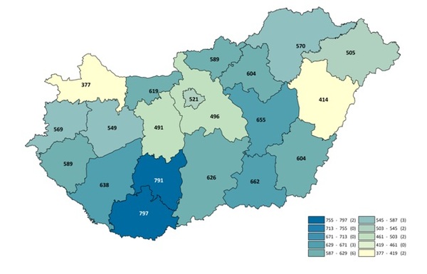 10 000 lakosra vetítve a megyei lakóhellyel rendelkező betegek száma alapján elmondható, hogy a dél-dunántúli régió lakosai jelennek meg leginkább a szakellátásban, ami egyfelől jelezheti a diagnózissal rendelkezők magasabb számát, de a szakellátásra szorulók nagyobb arányát is (országos átlag: 453 beteg/10 000 lakos).