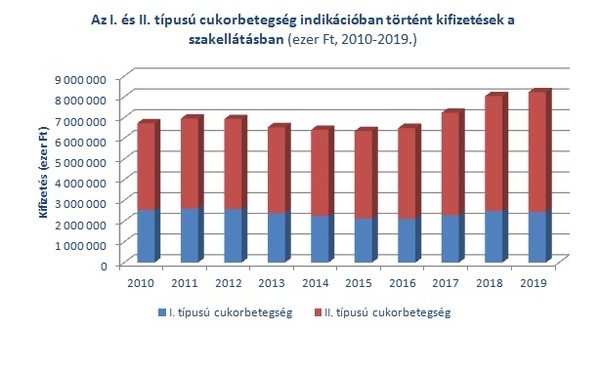 Bár a betegek szakellátásaihoz kapcsolódó, egy főre jutó kifizetés az I. típusú betegség ellátása esetén magasabb, mint a II. típus esetében (2019. évben előbbi 26 200 Ft-nak, utóbbi 14 800 Ft-nak adódott), a magasabb betegszám miatt a szakellátások utáni teljes kiadás 70%-a (2019-ben mintegy 5,8 milliárd forint) a II. típushoz kapcsolódik, amelynek növekedési üteme is nagyobb mértékű