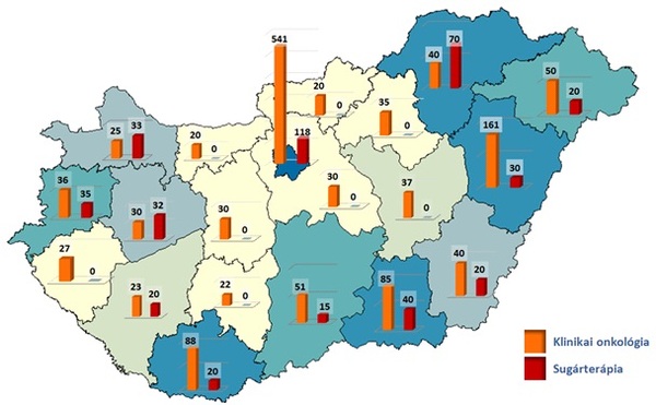 Klinikai onkológiai ellátást jelenleg összesen 87 intézmény nyújt járóbetegek, és 30 centrum fekvőbetegek részére (sugárterápiát összesen 13 centrumban végeznek). Az onkológiai fekvőbeteg-szakellátás tekintetében az Országos Onkológiai Intézet és az egyetemi klinikák rendelkeznek legnagyobb ágyszámmal, de a fekvőbetegek ellátására minden megyében lehetőség van. Az ágyak száma megyénként: