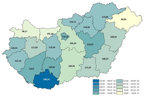 2019-ben a fekvőbeteg-szakellátás keretében ellátott daganatos betegek 10 ezer lakosra jutó száma országos átlagban 111,76 beteg volt, megyénként az alábbiak szerint alakult (a beteg lakóhelye szerint):
